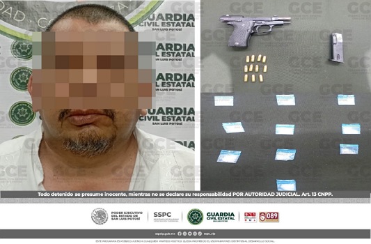 Ciudad Fernández, S.L.P.- Como resultado de los trabajos operativos desplegados en la región Media, policías de la Guardia Civil Estatal (GCE) detuvieron a un hombre, por los presuntos delitos de portación de un arma de fuego y posesión de estupefacientes.