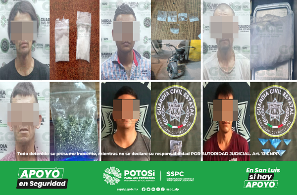 También en la colonia General I. Martínez, a Juan “N” de 30 años de edad le aseguraron cinco dosis de crack y una motocicleta de su propiedad; durante los dispositivos en la colonia Rural Atlas, a Alejandro “N” de 40 años le aseguraron una dosis de “cristal”; otro de los hechos ocurrió en la colonia General I. Martínez, ahí a Gabriel “N” de 40 años le aseguraron una bolsa con marihuana. En el municipio de Soledad de Graciano Sánchez, tres hombres fueron arrestados, el primero se ubicó en la colonia Morelos, ahí Cristian “N” de 24 años le aseguraron dos dosis de “cristal”; en la colonia La Sierra, a Yogan “N” de 23 años le aseguraron una bolsa con marihuana; a su vez, en la colonia Praderas del Laurel, a Christopher “N” de 18 años le aseguraron una dosis de marihuana.