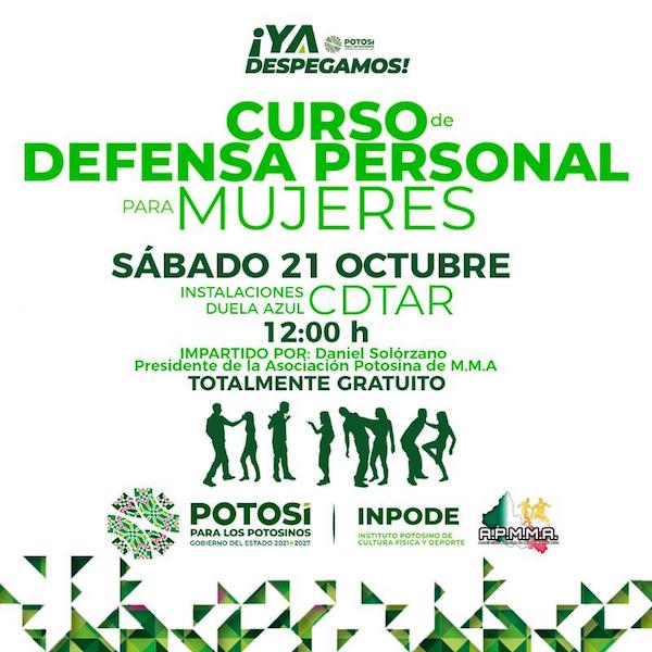 El Instituto Potosino de Cultura Física y Deporte (Inpode) y la Asociación Potosina de Artes Marciales Mixtas, realizarán el curso gratuito de defensa personal, dirigido a mujeres, para fortalecer las acciones de prevención en apoyo a las potosinas. El taller se realizará este sábado 21 de octubre a las 12:00 horas en el Centro para Desarrollo de Talentos y Alto Rendimiento Deportivo Plan de San Luis.