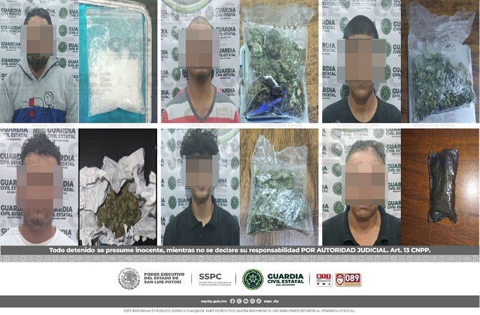 S.L.P.- Derivado de los diferentes operativos de seguridad, efectuados por policías de la Guardia Civil Estatal (GCE), 11 personas resultaron detenidas por probable posesión de narcóticos. Los aseguramientos fueron tanto en la capital potosina como en el interior del Estado.