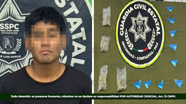 En una primera intervención, derivada de los patrullajes preventivos efectuados en la capital potosina, elementos de la GCE detuvieron a Leonel “N”, de 35 años, por la posesión de droga.