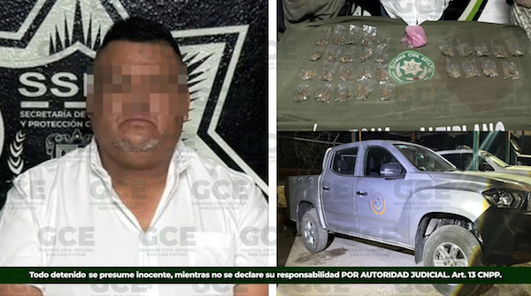 En una segunda acción, derivada de una denuncia anónima, elementos estatales y federales detuvieron a Jorge “N”, de 42 años, quien se identificó como director de la Policía Municipal de Matehuala a quien se le aseguraron 52 bolsas de marihuana con un peso aproximado de 334 gramos, tres bolsas de “cristal” con un peso de 30 gramos, además de un vehículo oficial Nissan Versa.
