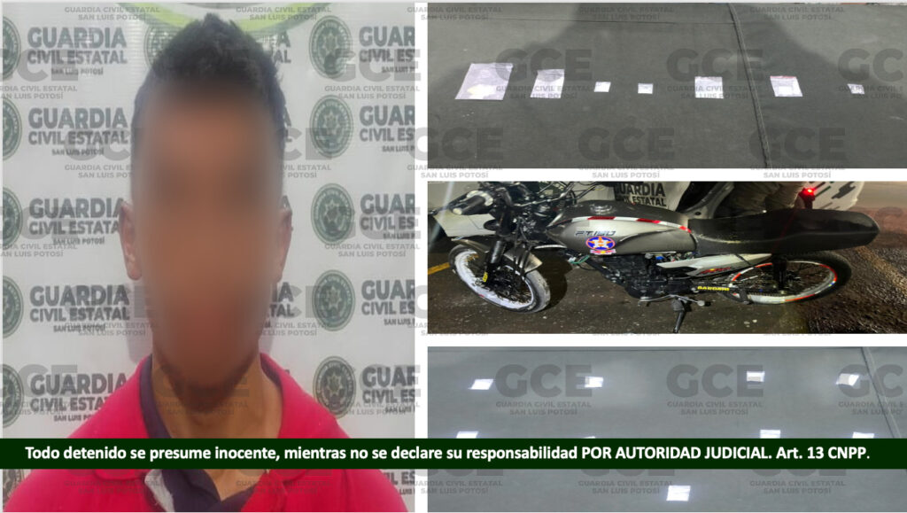 Por otro lado, en los despliegues efectuados en la zona oriente de la ciudad, en Periférico Oriente y Prados en el Municipio de Villa de Pozos, un menor de 17 años quedó detenido, luego de que presuntamente poseía siete dosis de la droga sintética conocida como “cristal”, además de asegurarle una motocicleta Italika tipo FT150 en color gris/negro modelo 2022 sin reporte de robo.