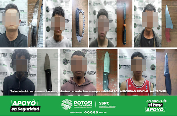 S.L.P.- Operativos de seguridad y vigilancia efectuados tanto en la capital del estado como en su zona conurbada, derivaron en la detención de siete personas, quienes fueron sorprendidas por la Guardia Civil Estatal (GCE), con armas prohibidas que llevaban consigo.