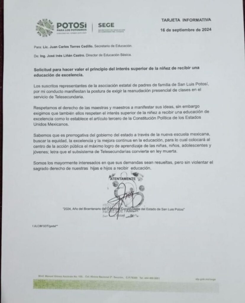 En un comunicado emitido por la Asociación Estatal de Padres de Familia de San Luis Potosí, se ha hecho un llamado enérgico para asegurar la continuidad del servicio educativo en las Telesecundarias de manera inmediata, sin que ello afecte a los estudiantes.