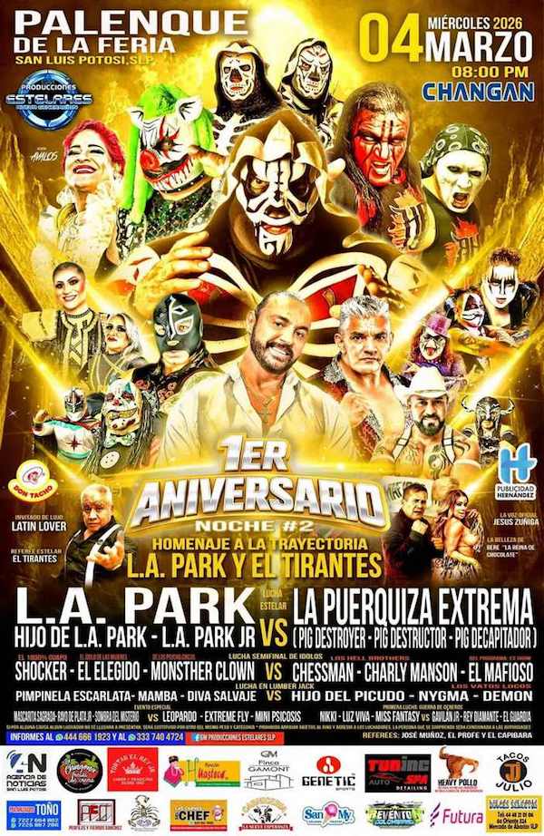 La visión del Gobernador Ricardo Gallardo Cardona de mantener activos los espacios públicos y fomentar el sano esparcimiento continúa dando resultados con la función de Primer Aniversario, Noche #2, que se realizará el miércoles 4 de marzo en el Palenque de la Feria Nacional Potosina (Fenapo). Esta velada rendirá homenaje a las leyendas L.A. Park y El Tirantes, en un cartel que reúne a destacadas figuras de la lucha libre nacional y reafirma el impulso sin límites al entretenimiento.