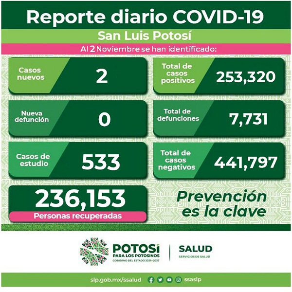 Con el registro de dos nuevos casos de Covid-19 en el Estado, el Comité Estatal para la Seguridad en Salud y los Servicios de Salud confirman 253 mil 320 casos totales de este padecimiento.