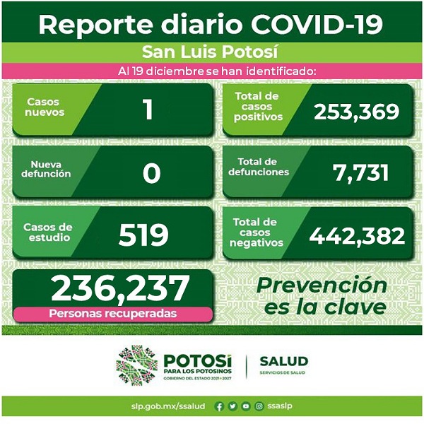 El nuevo caso se detectó en la Jurisdicción Sanitaria I, perteneciente a la capital; en las jurisdicciones sanitarias, II de Matehuala, III de Villa de Pozos, IV de Rioverde, V de Ciudad Valles, VI de Tamazunchale y VII de Tancanhuitz no se presentaron casos nuevos ni en personas residentes de otra entidad.