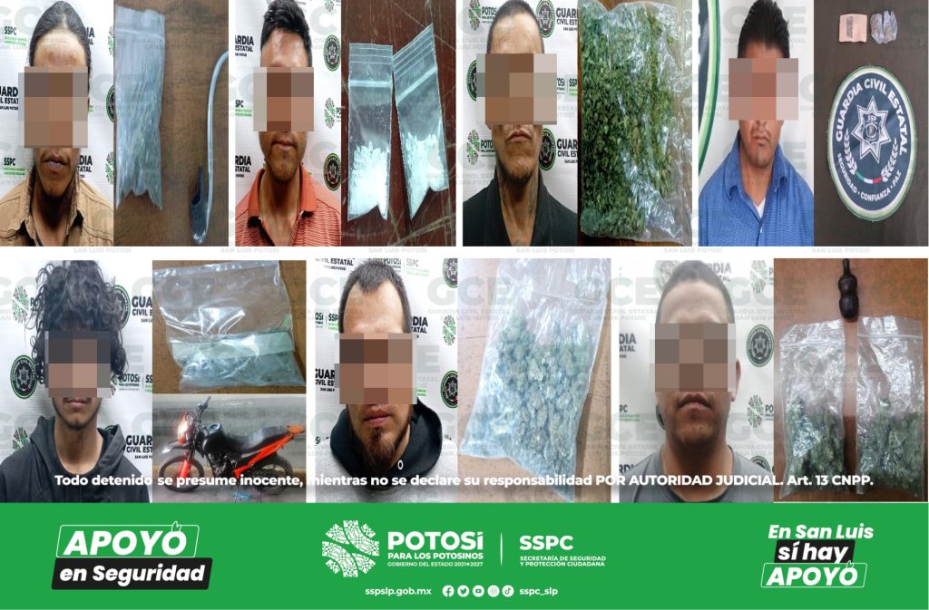 En el municipio de Soledad de Graciano Sánchez, oficiales de la GCE detuvieron a José “N” de 48 años de edad, en la colonia El Morro; sobre la colonia El Terremoto a Oscar “N” de 32 años lo detuvieron con una dosis de “cristal”; también a Omar “N” de 29 años lo detuvieron con una dosis de marihuana en la misma zona; en la colonia Ponciano Arriaga a César “N” de 31 años le aseguraron dos bolsas con marihuana; sobre la colonia San Francisco a Erick “N” de 19 años lo detuvieron con una dosis de “cristal”