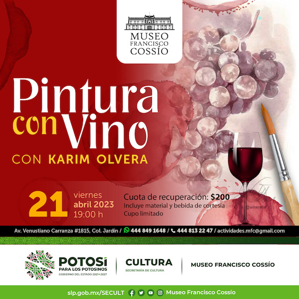 La Secretaría de Cultura de San Luis Potosí invita al público a participar en la actividad “Pintura con vino” que se llevará a cabo en el Museo Francisco Cossío este viernes 21 de abril, a las 19:00 horas, como parte de las actividades del mes de abril, con una cuota de recuperación de $200 incluye material.