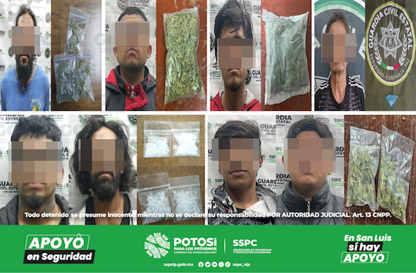 Tan solo en la capital potosina, elementos de la Guardia Civil Estatal (GCE) detuvieron a 11 presuntos que fueron sorprendido con marihuana y/o “cristal”: en la calle de León García de la colonia Jaime Torres Bodet, se detuvo a Eleazar “N” de 41 años por posesión de tres bolsas con marihuana; en las calles de León y avenida Mezquital, de la colonia El Mezquital, se aseguró a Jorge “N” de 19 años, detenido por posesión de una bolsa con marihuana; al norte de la ciudad, en las calles de Villareal y Villa General Mitre, en la colonia Buenos Aires, los agentes estatales aseguraron a Sergio “N” de 24 años, quien llevaba consigo una bolsa con marihuana.
