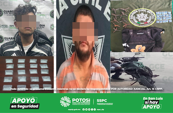 A su vez, en el interior del estado, en el municipio de Villa de Guadalupe, oficiales de la GCE desplegaron un operativo en la comunidad Vallejo, en seguimiento a los trabajos de inteligencia detectaron que en la zona había movimiento ilícito en relación a la venta y distribución de narcóticos. Gracias a la incursión de los agentes estatales, se desmanteló un supuesto punto de comercialización de droga, en donde fueron capturados Gilberto “N” de 37 años de edad y Romer “N” de 44 años, a quienes se les aseguraron 12 bolsas con marihuana y 11 dosis de “cristal”, así como un arma de fuego artesanal.