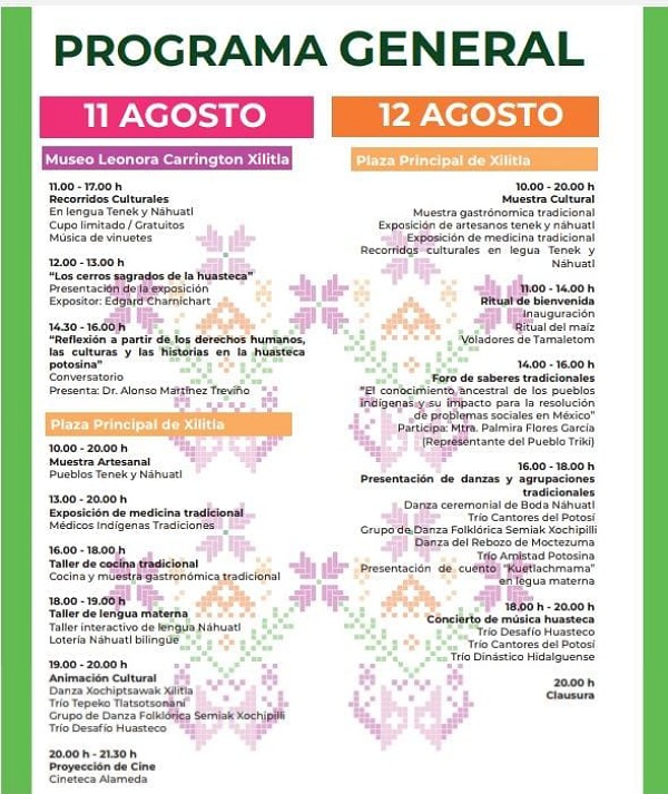 El titular del Indepi, Filemón Hilario Flores, detalló que, el 11 de agosto, a partir de las 10:00 horas, se realizará la presentación de la exposición, “Los Cerros Sagrados en la Huasteca” en el Museo Leonora Carrington de Xilitla, así como el Conversatorio Reflexión a partir de los derechos humanos, «Las culturales y las historias en la Huasteca potosina». Este mismo día, se llevará a cabo en la plaza principal de Xilitla, una proyección de cine a cargo de Cineteca Alameda, entre otras actividades.