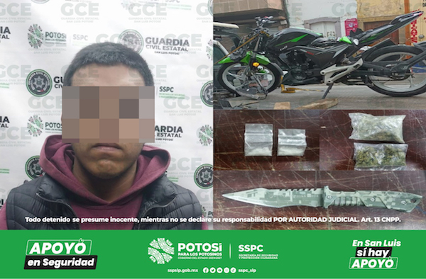 Uno de los hechos ocurrió en el Barrio de Tequisquiapan, oficiales de la GCE detuvieron a un motociclista quien trató de huir de la presencia policiaca, lo que derivó en una persecución en donde puso en riesgo la integridad de otras personas; el presunto impactó su unidad marca Italika contra la unidad policial de la GCE, provocando daños a la carrocería de la misma. Tras una inspección a su persona, a Jonathan “N” de 19 años de edad, se le aseguró un cuchillo en su poder, así como dos bolsas con marihuana y dos dosis de “cristal”.