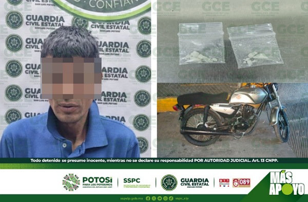 San Luis Potosí, S.L.P.- Como resultado de los operativos de seguridad que son implementados por los elementos de la Guardia Civil Estatal (GCE), un hombre fue detenido por los presuntos delitos de tripulación de una motocicleta con placa sobrepuesta y posesión de droga.