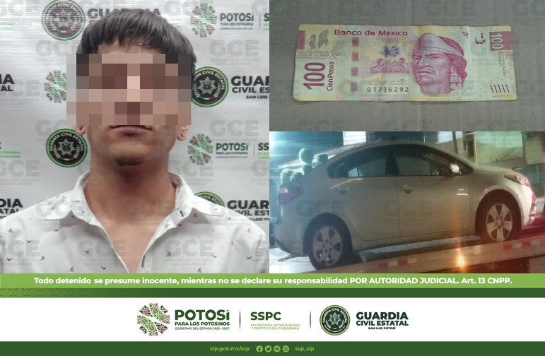 San Luis Potosí, S.L.P.- En acciones de seguridad y vigilancia realizadas por las autoridades de la Guardia Civil Estatal (GCE), un hombre fue detenido en el Barrio de Tequisquiapan tras ofrecer dinero en efectivo a los uniformados a cambio de evadir su responsabilidad legal, luego de ser detectado conduciendo de manera temeraria.