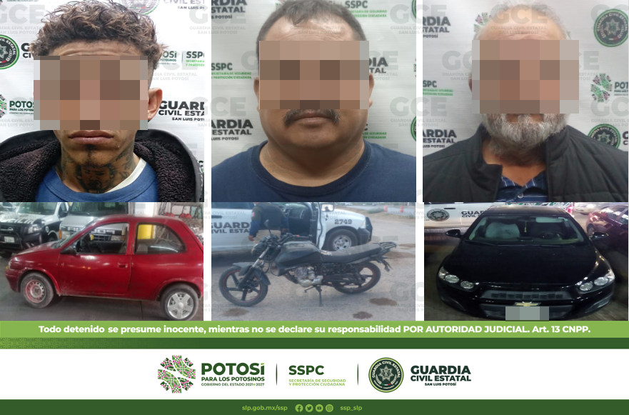 San Luis Potosí, S.L.P.- Como resultado de los dispositivos implementados en los diferentes sectores de la ciudad capital en el marco del Operativo “Semana Santa Segura 2023”, tres hombres fueron detenidos por la Guardia Civil Estatal (GCE) por el probable delito de tripulación de unidades con reporte de robo.