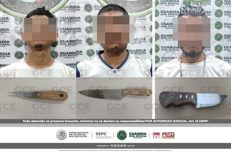 Una de las detenciones tuvo lugar en la colonia Damián Carmona, elementos de la GCE detectaron a Raymundo “N” de 29 años de edad, tras asegurarle un cuchillo entre sus pertenencias, fue detenido; otro de los hechos ocurrió en el fraccionamiento Olinda, en la delegación Villa de Pozos, Hernán “N” de 22 años y Roberto “N” de 37 años, quedaron detenidos luego de asegurarles dos cuchillos.