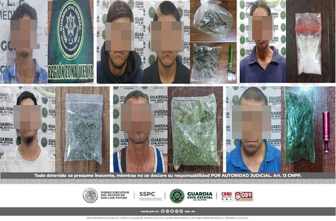 En las calles de General Francisco Naranjos y calle Malinche, de la colonia Gral. I. Martínez, se detuvo a Dulce “N” de 20 años por la posesión de una dosis de “cristal”; Mario “N” de 23 años, fue detenido en las calles de calle de Segunda Oriente y la avenida José de Gálvez, de la colonia Abastos, por presunta posesión de una bolsa de marihuana; un joven de 16 años de edad, fue detenido con una bolsa de marihuana en las calles de Bugambilias y Marianela, de las colonias Morales Saucito; Pedro “N” de 33 años, fue asegurado con una bolsa de marihuana en la avenida De la Luz de la colonia Villa María; Ángel “N” de 26 años de edad, fue asegurado con dos dosis de “cristal” en la avenida San Pedro de la colonia San Francisco en el municipio de Soledad de Graciano Sánchez; Said “N” de 21 años, fue detenido con dos dosis de “cristal” en la avenida Pujal y la calle de Rotarios en el municipio de Ciudad Valles y Juan “N” de 46 años de edad, es asegurado en la calle de Matamoros en el municipio de Rioverde luego de asegurársele tres dosis de “cristal”.