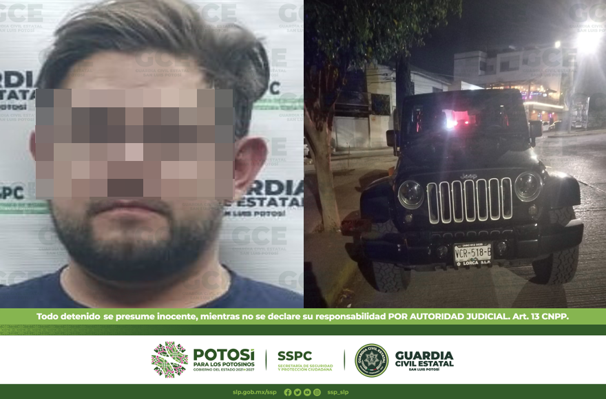 El hombre y su unidad marca Jeep, color negro, modelo 2016, con placas de esta Entidad, quedaron a disposición de la Fiscalía General del Estado.