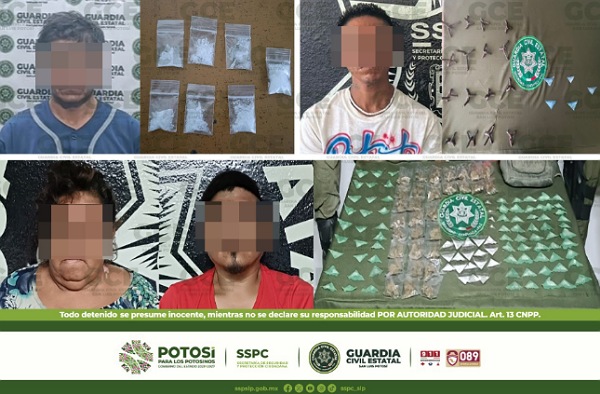 S.L.P.- En distintas acciones preventivas y de seguridad, elementos de la Guardia Civil Estatal, detuvieron a cuatro personas que presuntamente cometieron robos. Uno de los detenidos es un presunto asaltante de transeúntes.