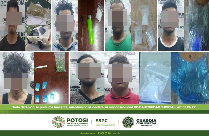 S.L.P.- En el marco de las acciones de seguridad y vigilancia para prevalecer el orden y la paz, realizadas en los 58 municipios del territorio potosino, agentes de la Guardia Civil Estatal (GCE) detuvieron a 19 personas por presuntos delitos contra la salud en su modalidad de posesión de droga.