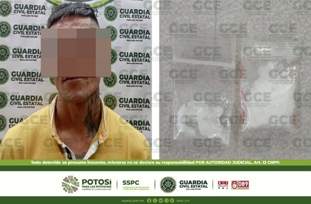 San Luis Potosí, S.L.P.- En recorridos de seguridad y vigilancia, oficiales de la Guardia Civil Estatal (GCE) detuvieron a un masculino con dosis de la droga sintética conocida como “cristal” o metanfetamina.
