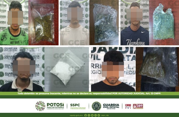 S.L.P.- Efectivos de la Guardia Civil Estatal (GCE) detuvieron en diferentes acciones a 11 personas, por el presunto delito de posesión de droga, tras los operativos en la capital potosina y en el interior del Estado.