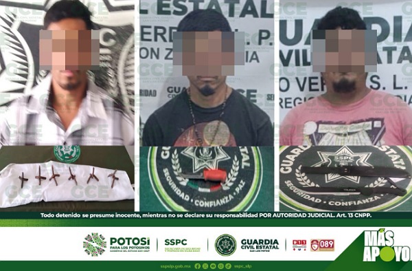 S.L.P.- En diferentes acciones, agentes de la Guardia Civil Estatal (GCE), detuvieron a tres presuntos criminales, luego de que se les aseguraran armas punzocortantes y objetos prohibidos, conocidos como “poncha llantas”.