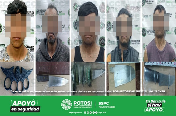 S.L.P.- Como resultado de los constantes trabajos preventivos, efectuados por la Guardia Civil Estatal (GCE) en las cuatro zonas del territorio potosino, cinco hombres fueron detenidos, tanto en la capital potosina y en el municipio de Soledad de Graciano Sánchez, por el probable delito de portación de armas prohibidas.