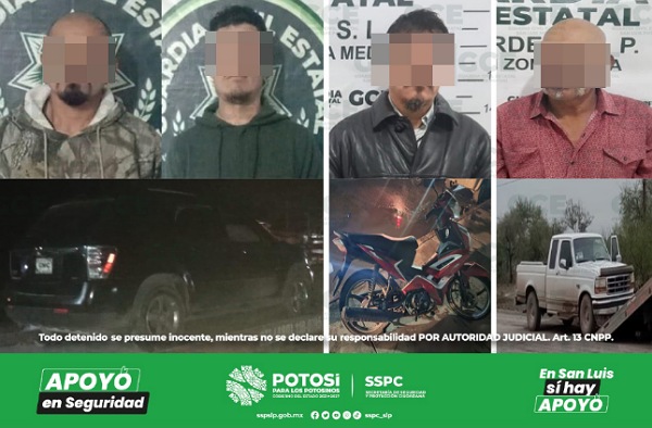 S.L.P.- Los patrullajes de seguridad y vigilancia, efectuados por la Guardia Civil Estatal (GCE), en los municipios de Tamazunchale, Rioverde y Ciudad Fernández, permitieron la detención de cuatro hombres por presuntos delitos contra la seguridad vial, al atentar contra su integridad y la de terceras personas.