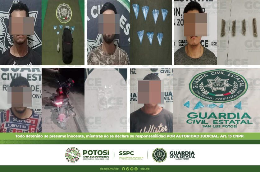Continuando con los operativos preventivos, en el municipio de Soledad de Graciano Sánchez resultaron detenidas 7 personas: Sergio de 20 años, a quien se le aseguró una dosis de “cristal”; en la colonia San Felipe, Teodoro de 36 años con cinco dosis de “cristal”; Oscar de 26 años en la colonia El Zapote, tras asegurarle una bolsa de marihuana; también, en la colonia Lomas de San Felipe, Juan de 44 años con tres dosis de “cristal”.