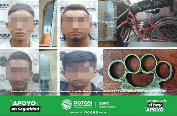 En la capital potosina se detuvo a ocho personas gracias a los patrullajes preventivos emitidos en las diferentes colonias: uno de los detenidos es Jorge “N” de 42 años de edad, quien fue sorprendido con un cuchillo en la colonia Rural Atlas; sobre la colonia Julián Carrillo, a José “N” de 19 años le aseguraron una manopla de metal conocida como bóxer; sobre la colonia San Ángel Tercera Sección, a Israel “N” de 27 años le aseguraron un machete; otro de los hechos ocurrió en la colonia Las Flores, Gustavo “N” de 28 años fue sorprendido con un cuchillo de 26 centímetros.