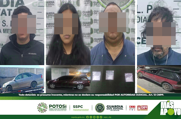 S.L.P.- En diferentes acciones operativas, oficiales de la Guardia Civil Estatal (GCE) detuvieron a cuatro masculinos, por probables delitos contra la seguridad vial, tras no respetar los lineamientos de seguridad y tránsito.