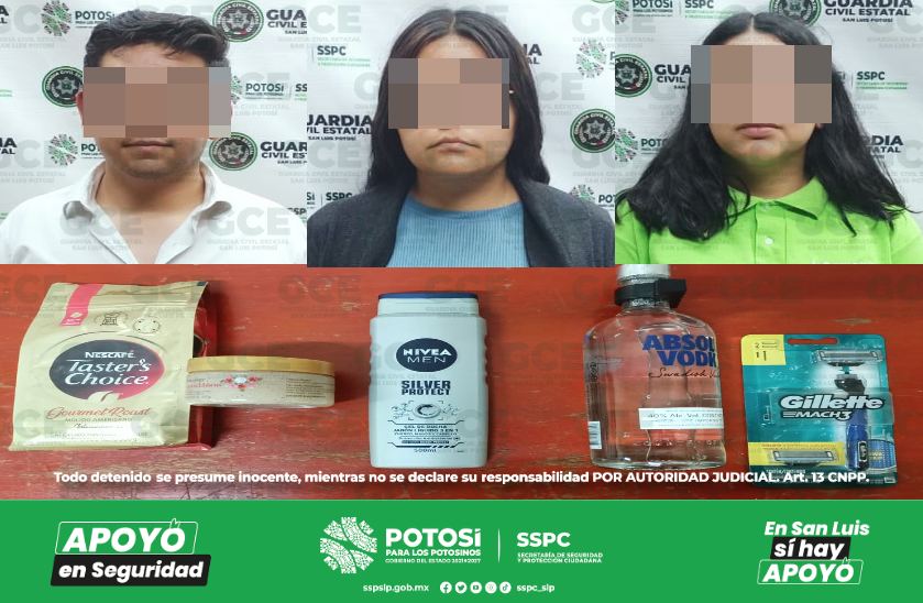San Luis Potosí, S.L.P.- Mediante una alerta emitida a través del Centro de Control, Comando, Comunicaciones y Cómputo (C-4), oficiales de la Guardia Civil Estatal (GCE) detuvieron a un hombre y a dos mujeres por el probable delito de robo a un supermercado ubicado en la zona poniente de la capital potosina.