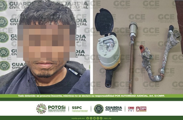 San Luis Potosí, S.L.P.- Una denuncia ciudadana atendida en la Línea de Emergencias 911 sobre un hombre que presuntamente provocó daños a una tubería y medidor de gas de un domicilio, movilizó a la Guardia Civil Estatal (GCE), logrando detener al presunto responsable de este hecho.