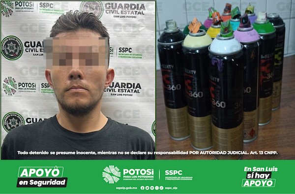 San Luis Potosí, S.L.P.- Autoridades de la Guardia Civil Estatal detuvieron a un hombre en la capital potosina, después de atender una denuncia ciudadana en donde el afectado indicó que dicha persona presumiblemente era la responsable de los daños a su inmueble tras realizar grafitis en la misma.