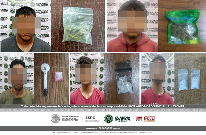 S.L.P.- En el marco de las acciones dispuestas para inhibir el consumo y venta de narcóticos en el territorio potosino, elementos de la Guardia Civil Estatal (GCE) detuvieron a cinco personas por el probable delito de posesión de droga.