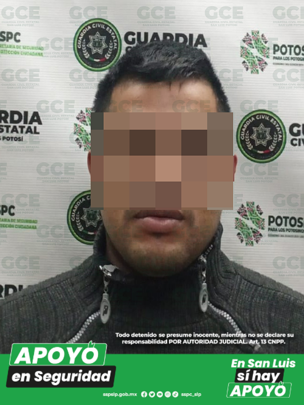 San Luis Potosí, S.L.P.- Mediante la intervención de la Guardia Civil Estatal (GCE) en un hecho de probable violencia familiar, se logró la detención de un individuo, identificado como cónyuge de la víctima, quien fue remitido a las autoridades por las presuntas agresiones a la afectada.