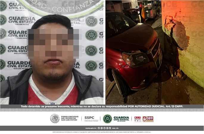 San Luis Potosí, S.L.P.- Derivado de los operativos de seguridad y vigilancia, efectuados por agentes de la Guardia Civil Estatal y mediante la atención a un reporte ciudadano, un automovilista fue detenido por probable manejo temerario y daños a propiedad privada.