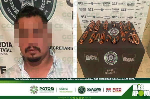 Las autoridades preventivas se desplazaron al tramo carretero Venado-Moctezuma, de la carretera 63, ahí fue detenido Juan “N” de 31 años, quien no pudo acreditar la posesión de 36 kilos de cobre, por lo anterior se procedió al aseguramiento del producto del robo.