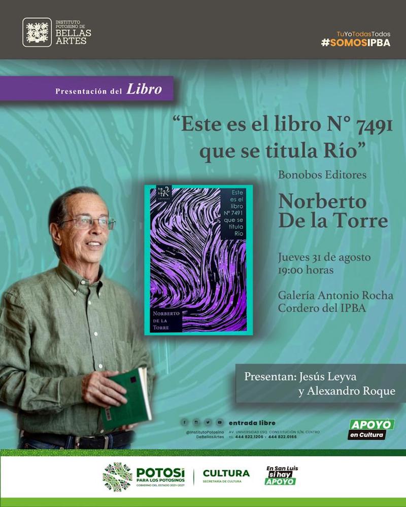 En San Luis Potosí si hay apoyo en cultura en sus diversas vertientes, y en este marco, la Secretaría de Cultura de Gobierno del Estado invita a la presentación editorial de “Este es el libro N° 7491 que se titula Río”, por Bonobos Editores, del autor Norberto de La Torre, que se llevará a cabo este jueves 31 de agosto a las 19:00 horas en la Galería Antonio Rocha Cordero del Instituto Potosino de Bellas Artes, contando con la participación del autor y comentarios por parte de Alexandro Roque y Jesús Leyva, entrada libre.