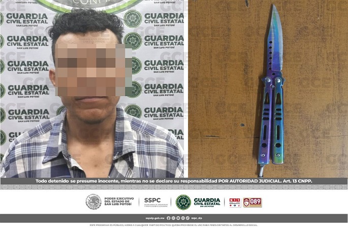 San Luis Potosí, S.L.P.- Mediante los operativos de seguridad y vigilancia, efectuados por agentes de la Guardia Civil Estatal (GCE) en la zona metropolitana, un hombre fue detenido por el probable delito de portación de un arma prohibida.
