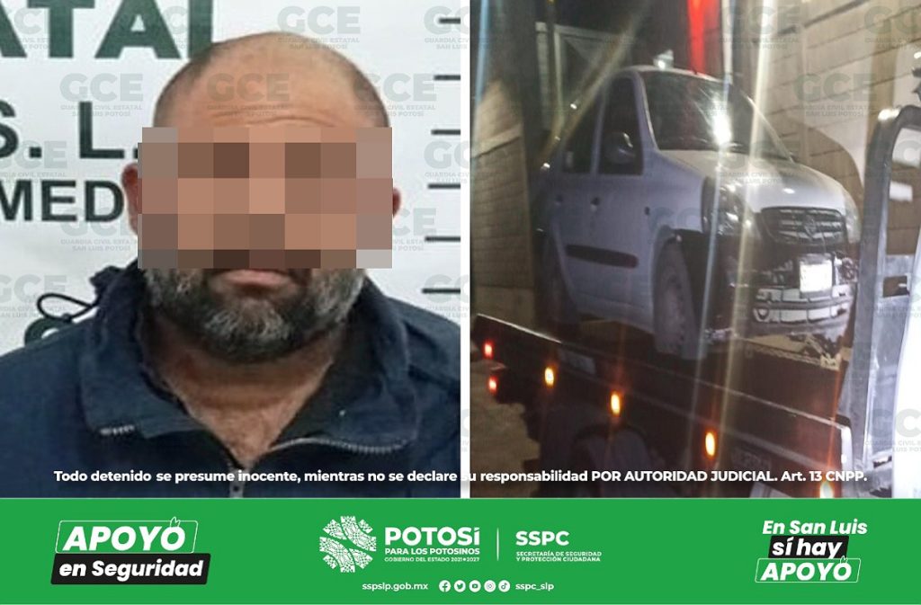 Rioverde, S.L.P.- En el marco de los operativos de seguridad, desdoblados para inhibir hechos constitutivos del delito, un automovilista fue detenido por la Guardia Civil Estatal (GCE) por probables delitos contra la seguridad de tránsito.