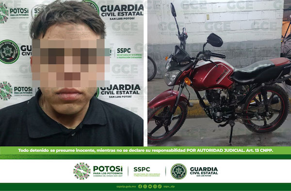 San Luis Potosí, S.L.P.- Mediante la reacción inmediata de la Guardia Civil Estatal ante el robo de una motocicleta, que fue reportada por la parte afectada al Sistema de Emergencias 911, los oficiales lograron la detención del presunto responsable; esta fue la sexta vez que las autoridades lo capturan por un probable delito similar.