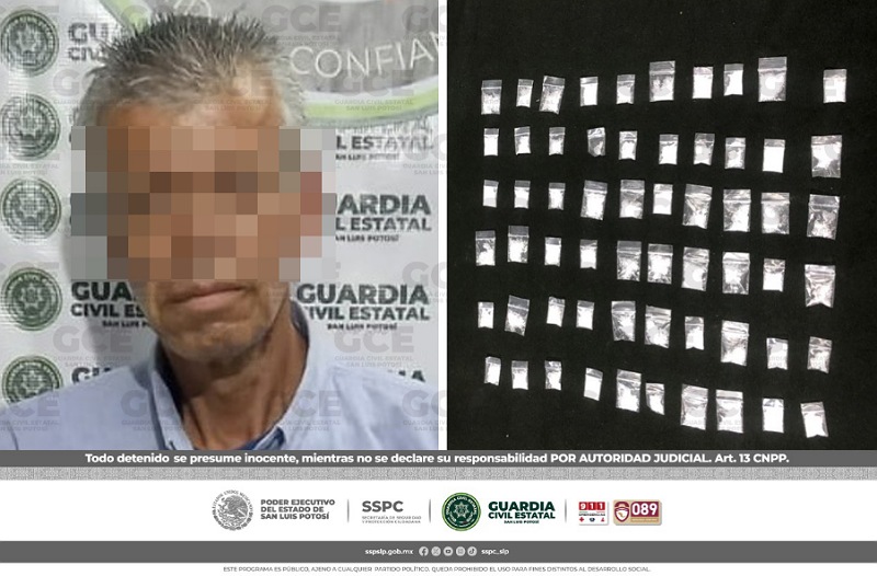 Soledad de Graciano Sánchez, S.L.P.- Mediante los trabajos coordinados entre agentes de Guardia Civil Estatal y la Policía Municipal, se logró la captura de un presunto narcomenudista a quien se le aseguraron 60 dosis de estupefacientes entre sus pertenencias.
