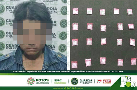 San Luis Potosí, S.L.P.- Acciones contundentes en la lucha contra el narcomenudeo en las cuatro regiones del Estado, dieron como resultado que elementos de la Guardia Civil Estatal detuvieran a un presunto vendedor de droga en el Barrio de Santiago.