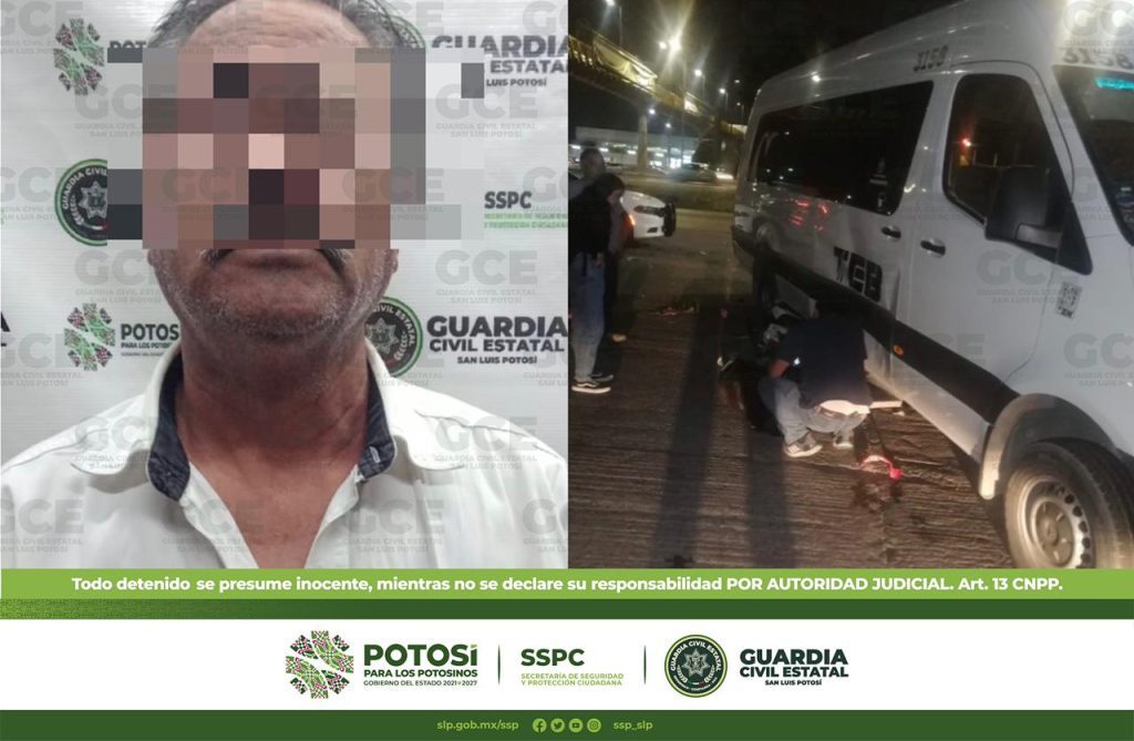 San Luis Potosí, S.L.P.- Elementos de la Guardia Civil Estatal (GCE) atendieron el reporte sobre un hecho de tránsito en donde un masculino resultó lesionado; en el lugar de los hechos, se detuvo al probable responsable del accidente vial.