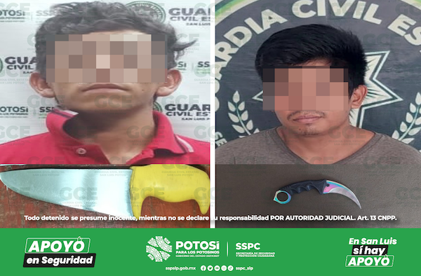 S.L.P.- Elementos de la Guardia Civil Estatal (GCE) detuvieron a dos hombres tras los operativos efectuados en la zona metropolitana y en la zona Huasteca; a los individuos se les aseguraron armas punzocortantes con las que deambulaban.