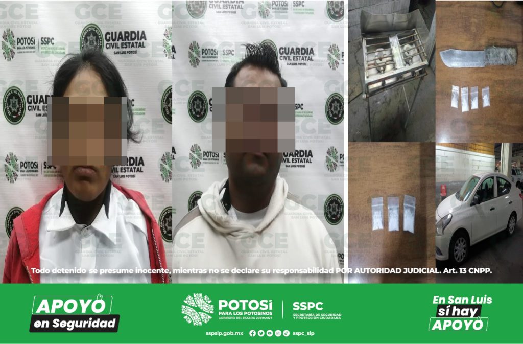 Soledad de Graciano Sánchez, S.L.P.- Tras la intervención oportuna de la Guardia Civil Estatal (GCE) ante un llamado de auxilio atendido en la Línea de Emergencias 911, una pareja presumiblemente dedicada al robo a casa habitación, fue detenida, evitando que huyeran con el producto del atraco; se les aseguró droga y un arma prohibida también.